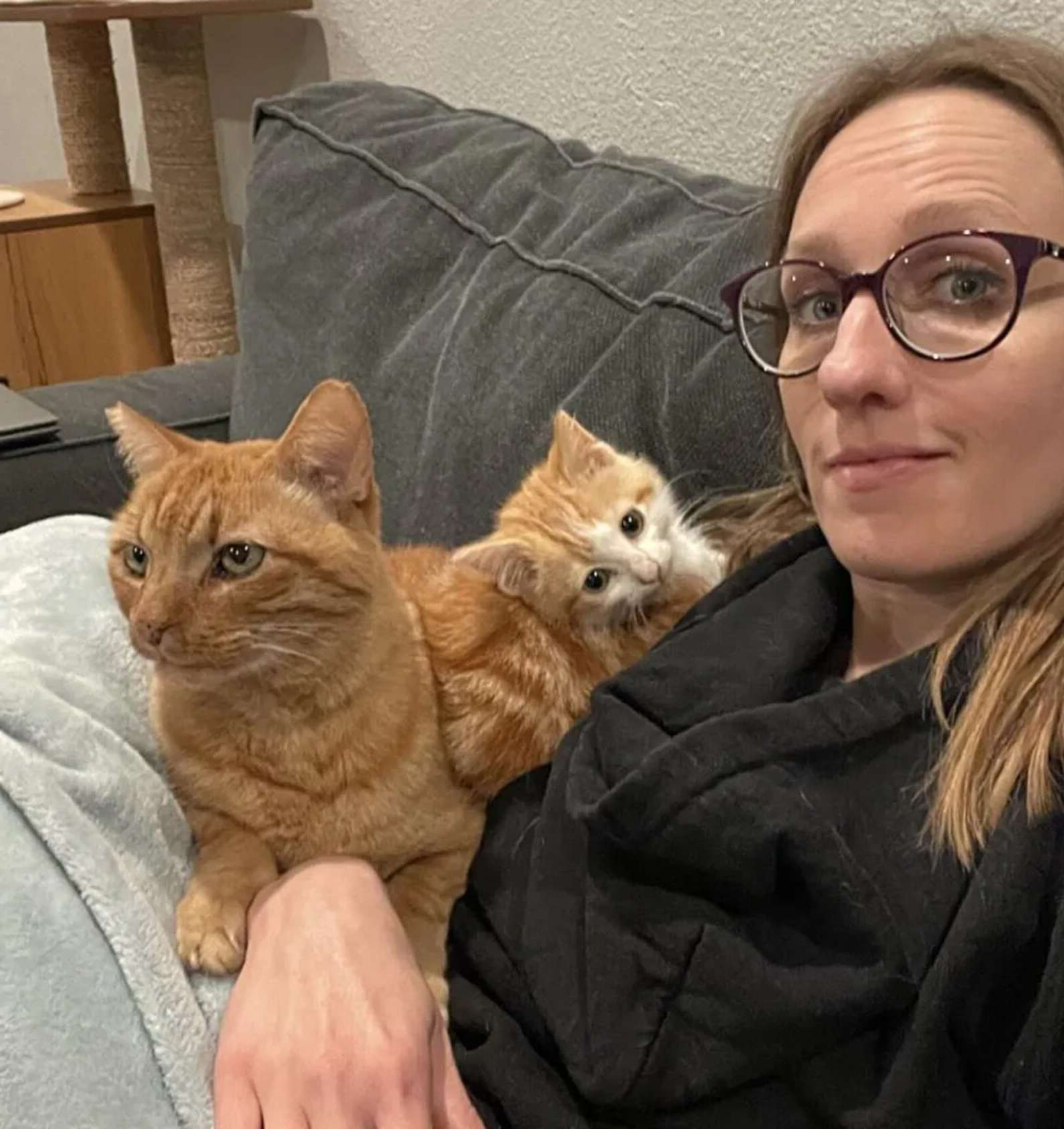 ▼Garfield的身上有蟲,還有一些其他的狀況,需要特別照顧。Megyn將牠帶回家後,才發現牠是一隻黏人又熱情的貓咪,平時很喜歡有人陪伴,還會喵喵叫著主動求關注,牠時時刻刻都想成為人們關注的焦點。但幾天之後,Garfield的注意力就被門廊上的另一隻橘貓Pickles吸引了。