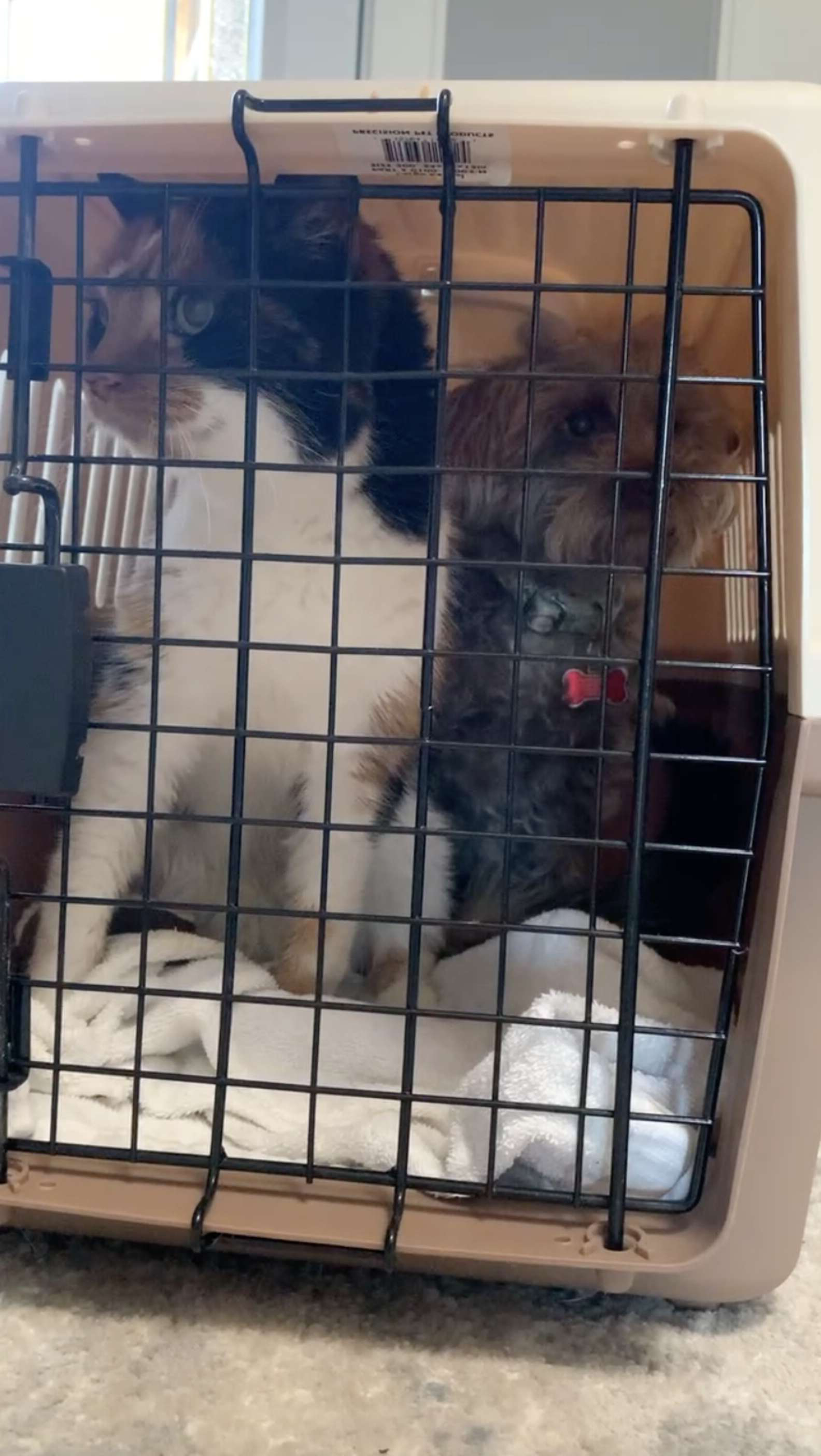 Ball看到擠在寵物箱中的貓咪和狗狗,忍不住哈哈大笑;獸醫院的醫生也表示,以前沒有見過這樣的場景。Skittles和Reese的感情太好了,看來狗狗不想讓貓咪孤孤單單地出門,不管貓咪要去哪裡,牠都要陪著一起去~