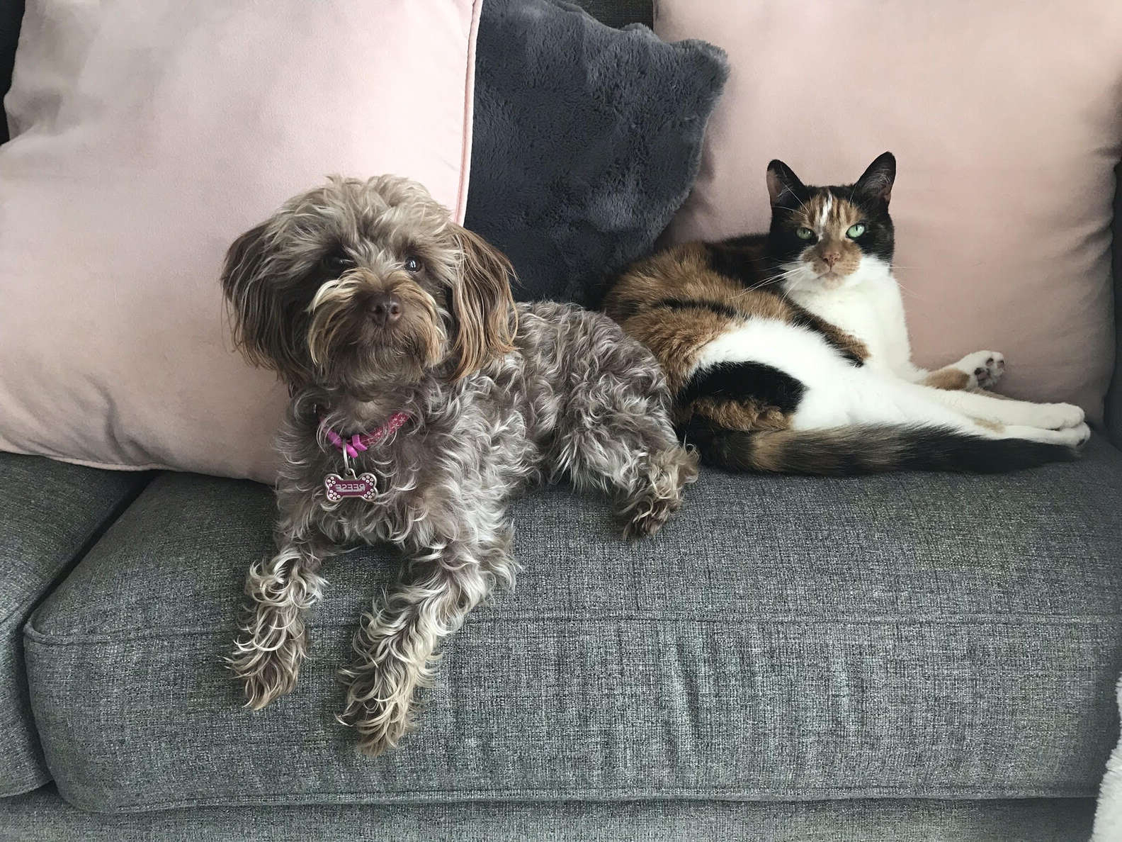 2022年01月26日貓咪和狗狗也能和平相處,很多家庭都是貓狗雙全~國外網友Jamie-Lee Ball家中有一隻狗狗Reese,還有一隻貓咪Skittles。自從5年前來到家開始,Reese就黏著15歲的貓咪阿姨Skittles。Skittles有時比較高冷,有時也會陪狗狗一起玩,一貓一狗相處得非常融洽。