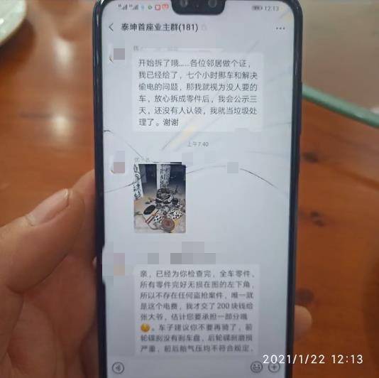 ▼隔天早上男子回來,發現那輛電動機車還在他的停車位上充電。他認為車主對自己發出的公告視而不見,於是再次發公告說:「各位鄰居做個見證。我已經通知了7個小時挪車和解決偷電問題,沒人回覆,我視為此車沒人要,我將它拆成零件,公示三天,三天後無人認領,將當作垃圾處理。」