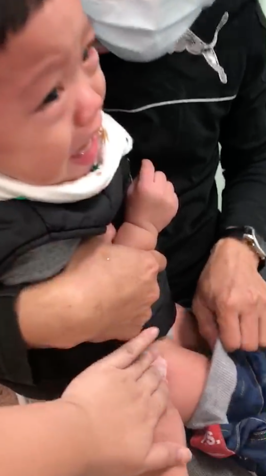 ▼1歲又7個月大的Chris發現褲子被爸爸退到膝蓋位,然後又看到護士阿姨拿出針…一忍不住就大哭了起來。