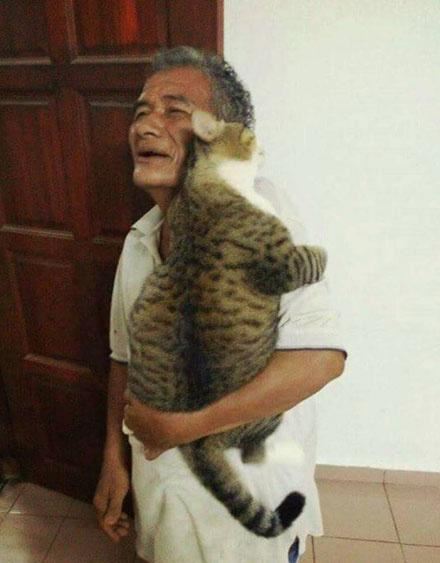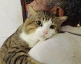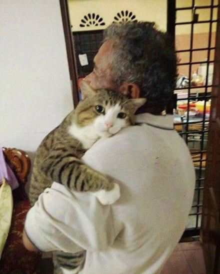 ▼當主人說要把愛貓接走時,牠好像立刻聽懂了一樣,緊緊抱住阿公…