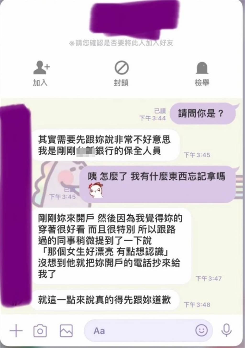 原po表示,她22日下午去板橋某銀行開戶,結果離開後發現有一名陌生男子加LINE。她追問對方的身分,對方說自己是該銀行保全。原po本以為自己有東西遺失,保全要通知自己回去領取,沒想到保全卻說:「覺得妳穿著很好看、很特別,跟櫃台提了一下很漂亮,想認識,對方就把妳電話給我了。」