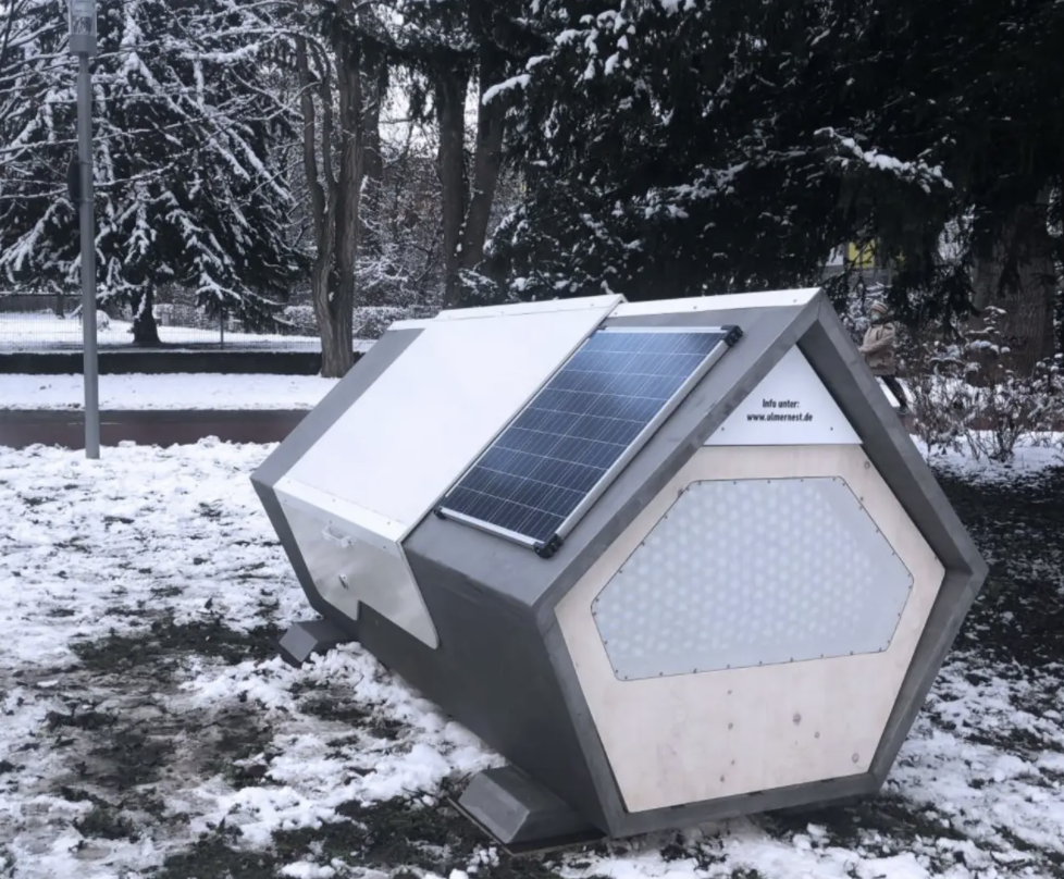 ▼睡眠艙配備太陽能電池板,還能連接Wi-Fi。目前已經有好幾個睡眠艙被安置在烏姆的公園裡了。設計團隊表示,這一睡眠艙是專為那些因為各種各樣的原因,無法進入收容所的街友設計的。這段期間因為需要避免外出群聚,睡眠艙的安裝延遲了一段時間,幸好能夠趕在最寒冷的夜晚來臨前裝好。