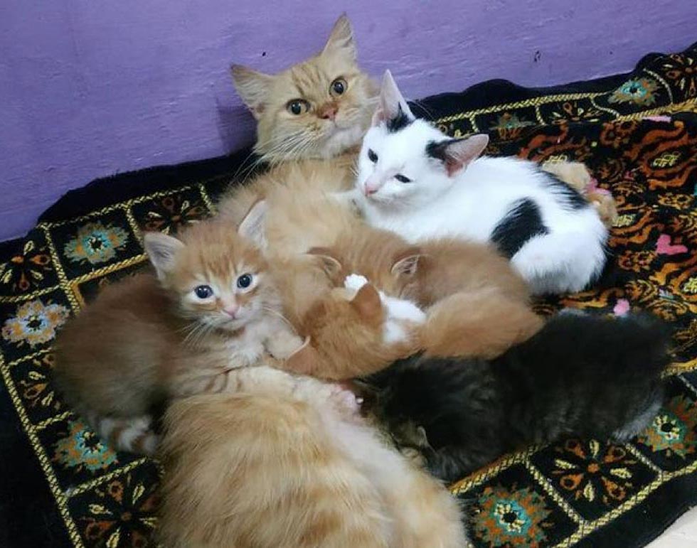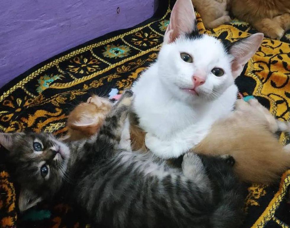 ▼Bella說:「Daniboi會跟小貓們一起睡覺,還會跟牠們一起陪在貓媽媽身邊。貓媽媽也不排斥牠,還會主動照顧牠。」