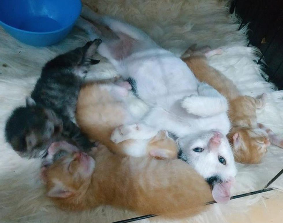 ▼Daniboi在4隻小貓之間,發出可愛的呼嚕聲,好像牠原本就屬於這裡一般。Bella笑說:「我非常驚訝,牠原本就很可愛,但我沒想到牠會這麼萌!」