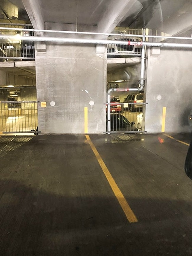 ▼這個停車場的停車格線條畫到牆上,幫助駕駛者判斷。