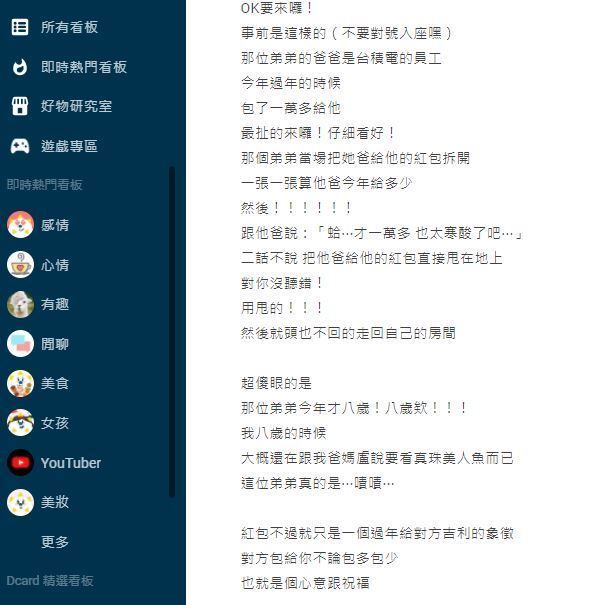 2022年01月28日小朋友都期待過年收到大紅包~日前一名女網友在Dcard分享了一件自己看到的事。今年過年的時候,一名台積電員工給8歲兒子包了一萬元的紅包,沒想到兒子數鈔票後非常失望,不僅將紅包甩在地上,還說「才1萬多,太寒酸了吧」。這讓原Po覺得很不可思議,網友們也覺得太扯了。