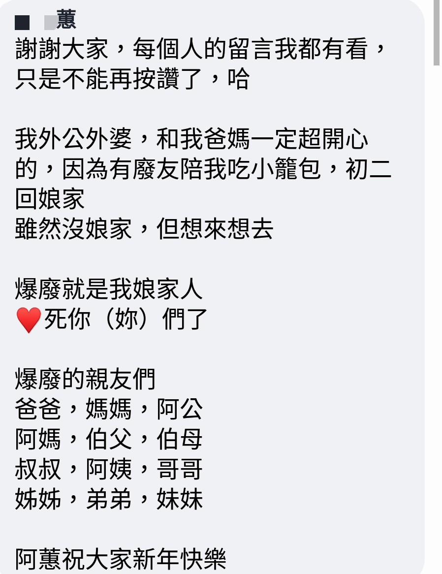 網友們看到這則貼文紛紛鼓勵原po:「妳並不孤單妳還有我們,新年快樂」、「心靈的豐足才是幸福快樂,很溫馨的團圓飯」、「新年快樂,最親的人永遠在你身邊守護著」。原po也非常樂觀,感謝網友們的暖心留言。祝原po新年快樂,健康平安~