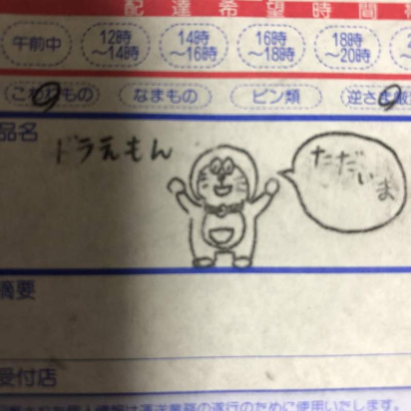 ▼朋友在寄回的快遞單上畫了哆啦A夢,還寫著:「我回來了!」