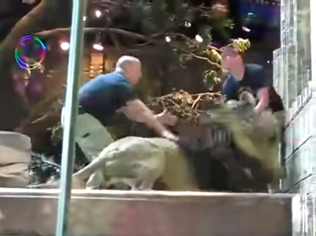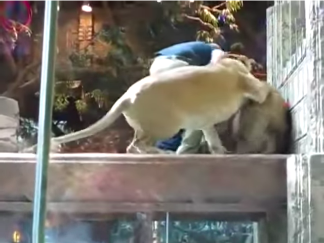 ▼母獅壓住雄獅,好像在用自己的方式安撫牠。雄獅的動作慢了幾拍,飼育員抓住機會跑開,連忙退出欄舍。雄獅已經不那麼激動了,但還是不甘心,在欄舍中轉了好幾圈,不停尋找那名飼育員,最後從旁邊的走道離開了。