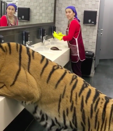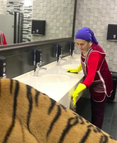 ▼那天Mikhail帶老虎出去玩,老虎口渴了,就趴在公共廁所的洗手台上喝水。牠大大的腦袋幾乎塞滿臉盆,一般人看到這一幕一定會嚇得跑開,但打掃阿姨卻非常淡定,還在擦拭檯面。