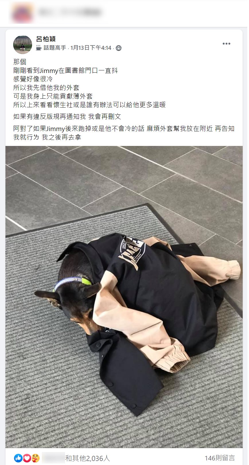 ▼那天呂柏穎在旺宏館前遇到冷得全身發抖的居米,他身上剛好有2件外套,就借出一件讓居米蓋著保暖。後來他在臉書po文,請路過的同學如果看見居米不需要外套了,麻煩幫忙將外套放在附近,他之後會去取走。後來有好心的同學留言說:「外套放在聖誕樹下了。」