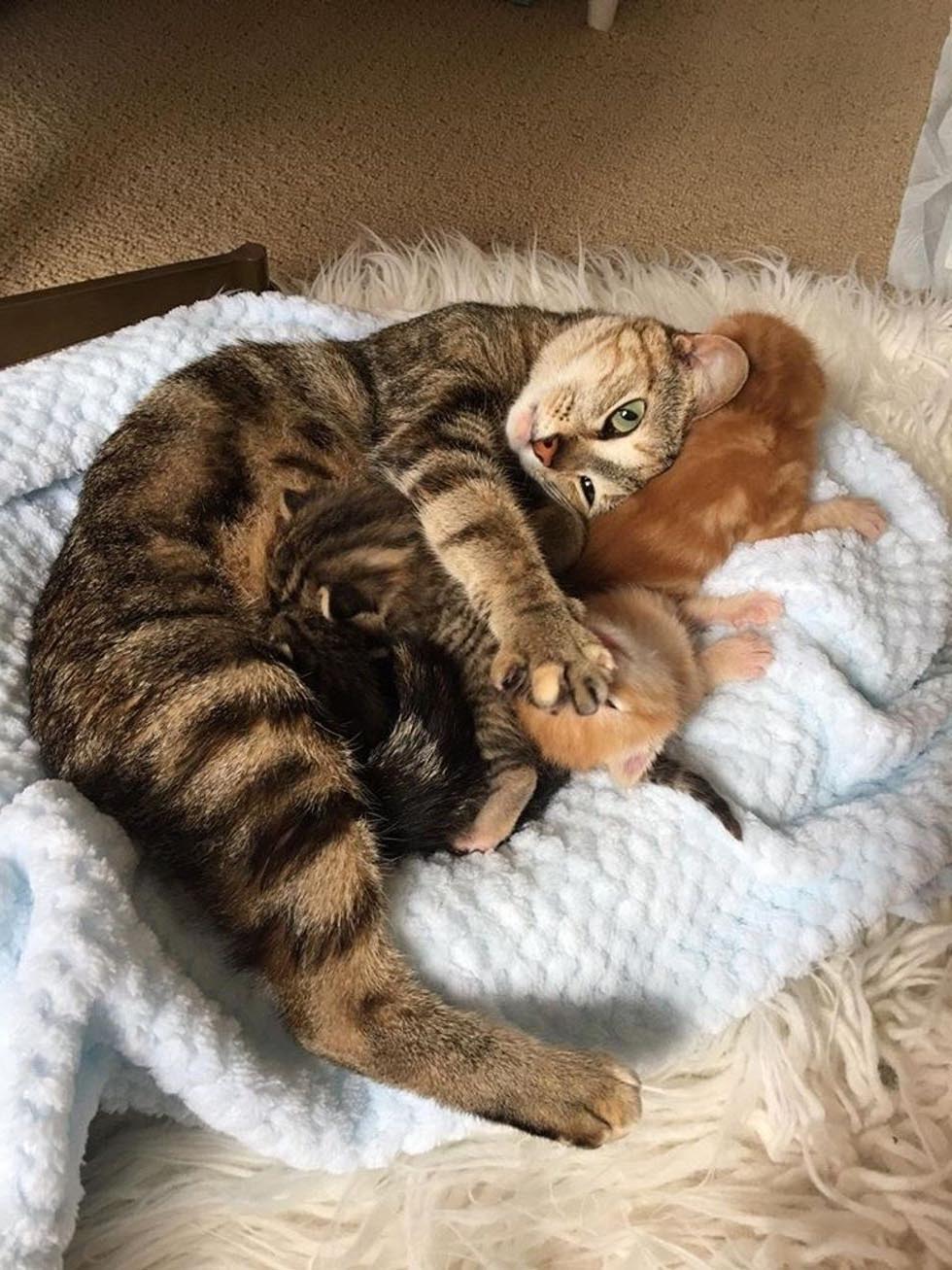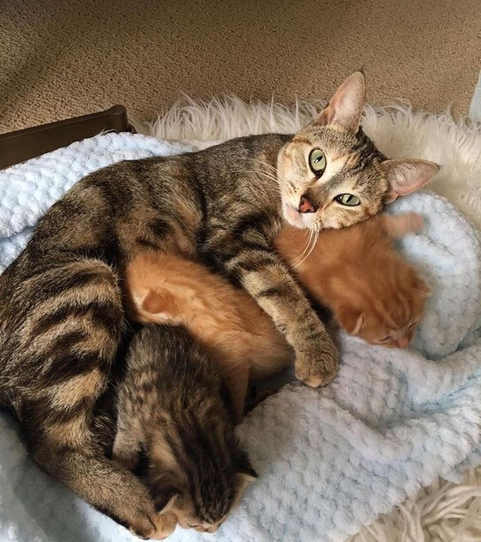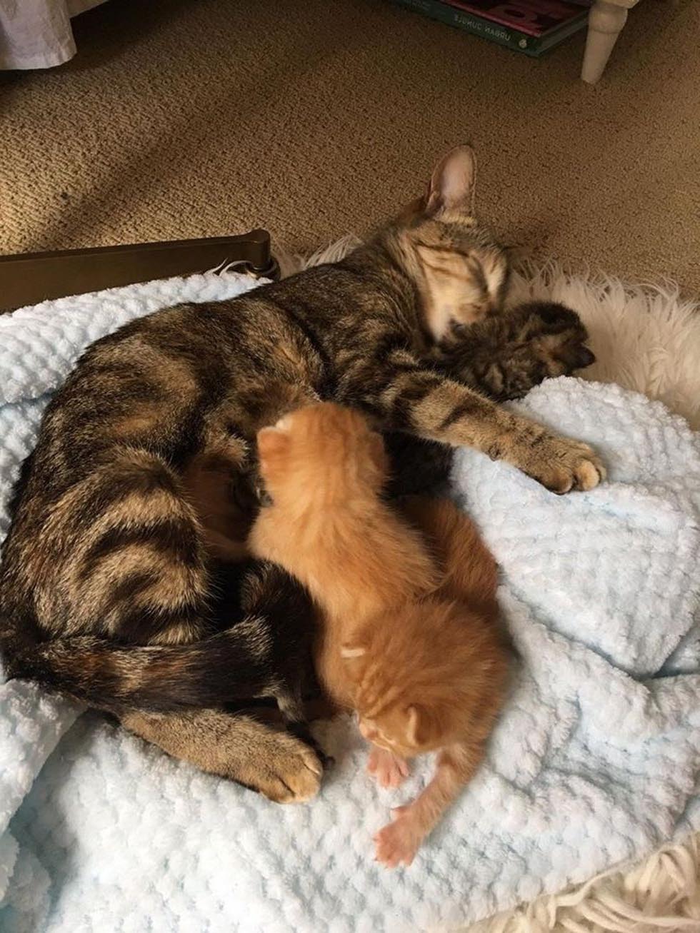 ▼貓媽媽來到小貓們所在的地方,毫不猶豫地躺到牠們中間,將自己的孩子抱在懷中,還發出了滿足的呼嚕聲。小奶貓們好像感應到了媽媽的存在,鑽進媽媽的懷裡吃起奶來。