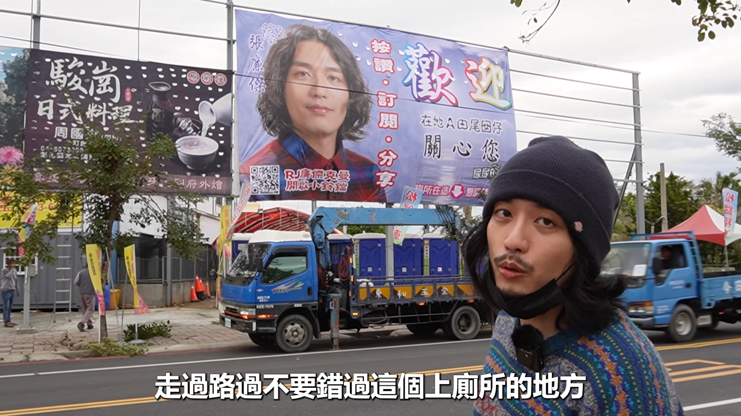 彰化的全新打卡熱點出現了!最近田尾公路花園流動公廁吸引不少民眾前往,大家都是為了看廁所上方的廣告看板。那是YouTuber「廉傑克曼」設置的廣告看板,上面有他的大頭照,用來宣傳他的YouTube頻道。因為這是附近唯一的公廁,他還在看板上寫「關心您尿尿的地方」,讓看到人忍不住笑出聲~