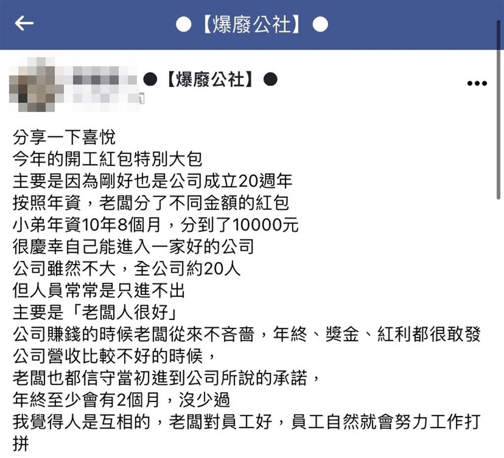 這名網友表示,今年是公司成立20週年,老闆按照年資發放不同金額的紅包,「小弟年資10年8個月,分到1萬元,很慶幸自己能進入一家好的公司」。原po透露說,雖然公司規模不大,只有約20人,但人員往往只進不出,主要原因就是「老闆人很好」。