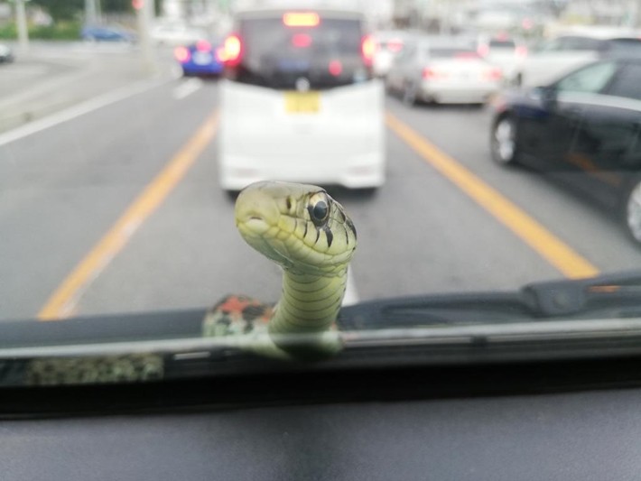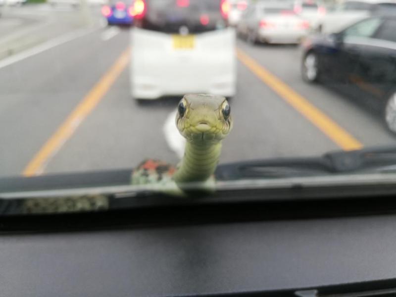 開車途中擋風玻璃「冒出一隻小蛇」! 牠超呆萌轉頭:泥要載我去哪裡?