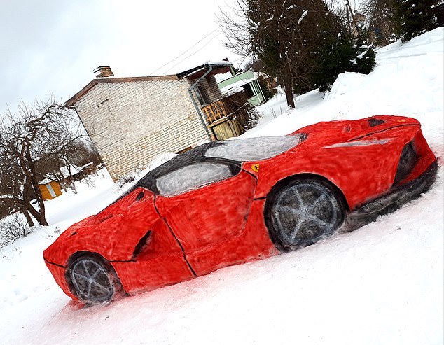 ▼這輛雪雕法拉利是當地居民Donata Bugiene的丈夫製作的。Donata將丈夫製作的過程拍下來,並介紹說這輛雪雕法拉利的尺寸跟真實的法拉利LaFerrari一模一樣:「我們認為如果不能買法拉利,就自己造一輛!現在沒有人可以否認,有一輛法拉利就停在我們的院子裡!」