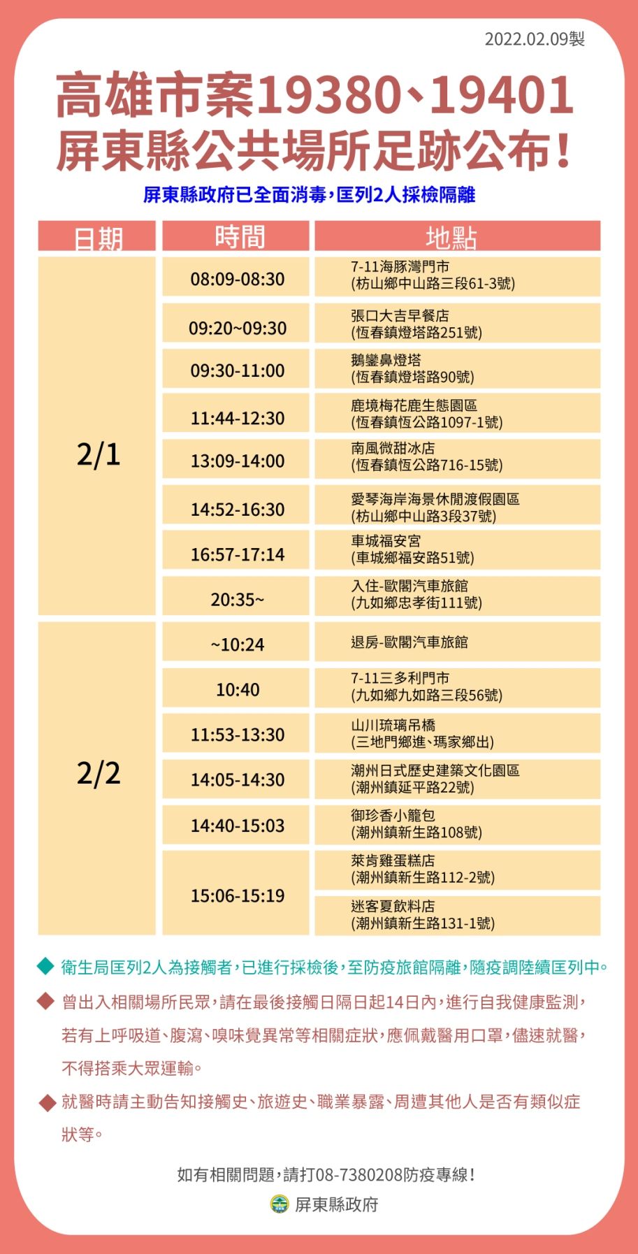 這對來自高雄的情侶分別是案19,380、案19,401。過年期間,2人與朋友結伴到屏東多地旅行。根據屏東縣疫調顯示,他們2月1日到枋山鄉7-11海豚灣門市、鵝鑾鼻燈塔、恆春鎮鹿境梅花鹿生態園區、南風微甜冰店、枋山鄉愛琴海岸海景休閒度假園區、車城福安宮、九如鄉歐閣汽車旅館;2月2日到九如鄉7-11三多利門市、山川琉璃吊橋、潮州日式歷史建築文化園區等地,然後返回高雄。