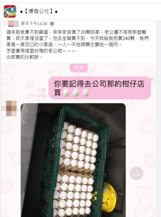 這名人妻在臉書社團「爆廢公社」發文說,她在過年前好不容易搶了20顆蛋回家,跟老公說現在雞蛋很難買,結果老公不相信,直到昨天家裡沒有蛋了,他決定親自去買買看。老公一開始在全聯沒有買到,改天去柑仔店看到一籃籃的雞蛋,竟全部搬回家,一共買了240顆。