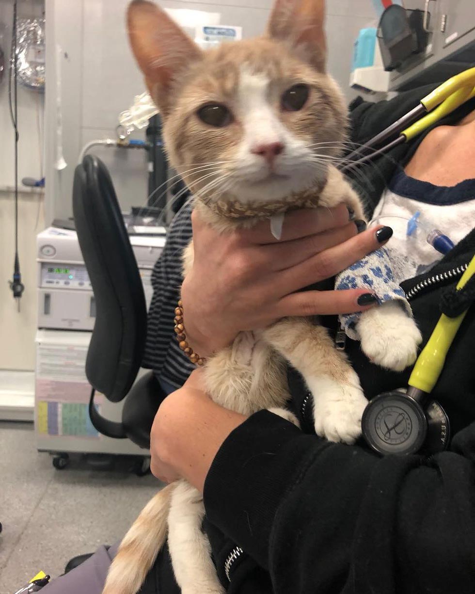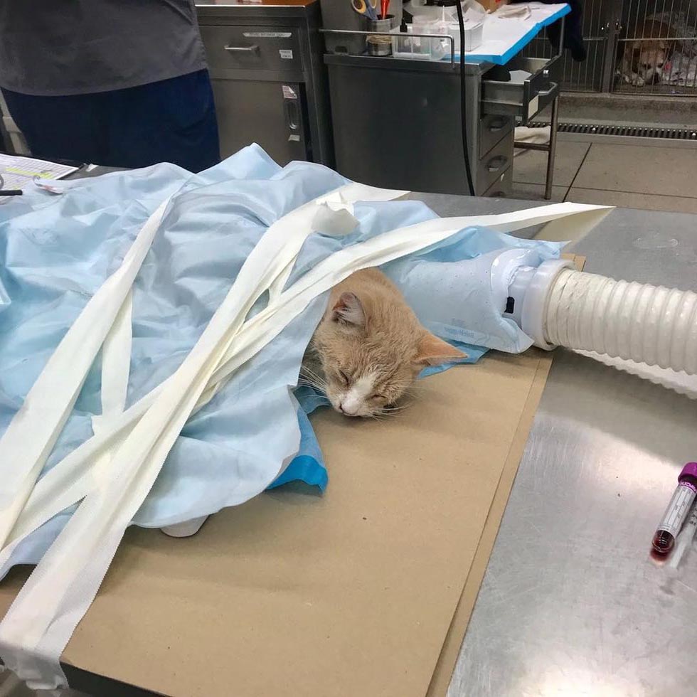 ▼Clayton的食道情況很糟糕,嘴巴裡還有潰瘍,暫時不能吃東西。獸醫只好透過餵食管幫牠進食,維持身體所需的營養。這一過程並不舒服,但Clayton似乎知道獸醫是在救牠,所以並沒有掙扎,還會發出呼嚕聲表達感謝。