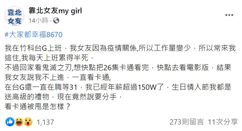 ▼這名男網友在臉書社團「靠北女友my girl」po文說,疫情期間女友的工作量變少,經常到他家借住。平時原po在竹科台積電上班,工作壓力比較大,回家第一件事就是看《鬼滅之刃》紓壓。他想快點把26集動畫看完,然後再去看電影版。