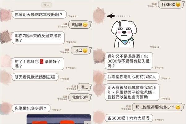 ▼原po無語,直接問女友:「那……妳覺得要包多少?」女友竟然回答:「各6600吧!六六大順啊!」原po覺得女友有點過分,將兩人的對話截圖po上網,問:「我們交往約2個多月,女友要我到她家拜年,覺得我包3600給她爸媽太少,長輩的紅包有行情價嗎?」