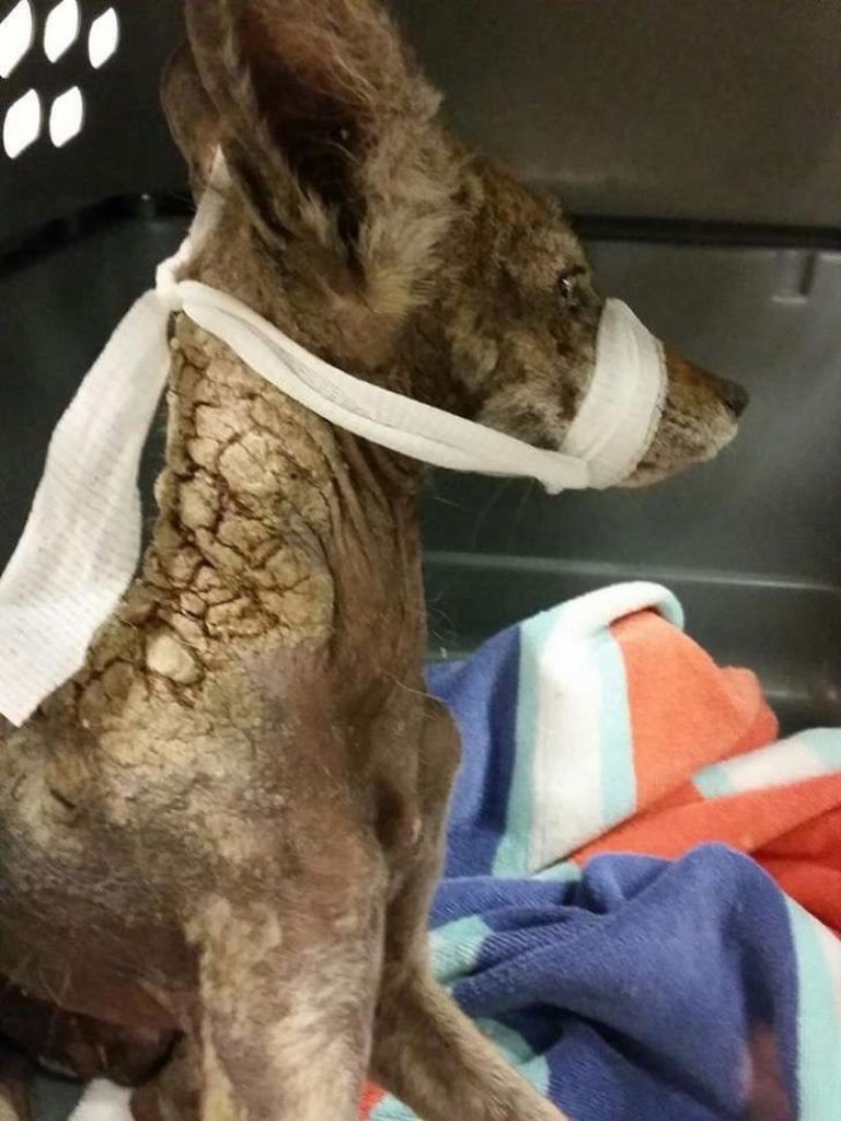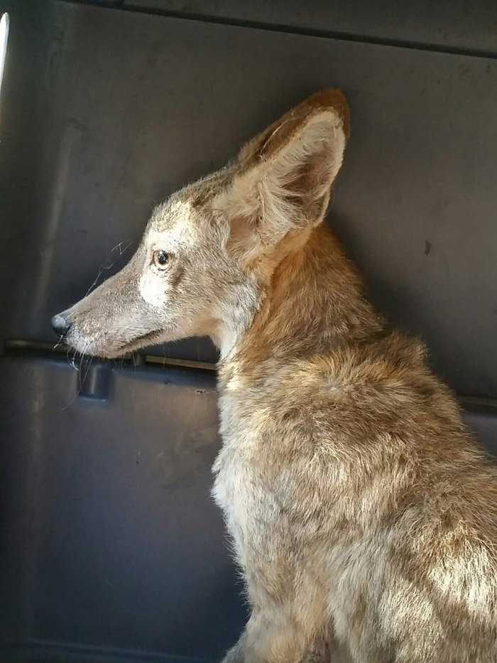 ▼救援人員把牠從角落抓出來時,才發現牠根本不是狗,而是一隻野生的土狼!