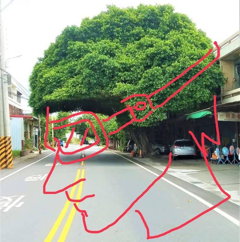 ▼當地民眾解釋說,這棵樹的造型並不是人為刻意修剪的,而是車身較高的貨櫃車、大卡車經年累月行經此處「削」出來的。多年下來,它的造型越來越像安全帽。