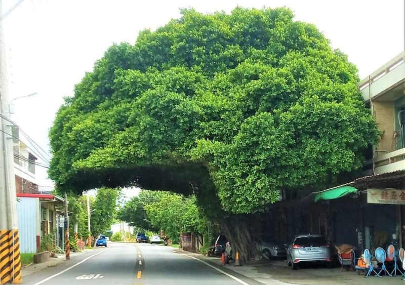 ▼這棵老榕樹位於埔鹽鄉員鹿路三段靠近番金路口,已經屹立近百年。去年12月,有網友將這棵大樹的照片po到臉書社團「爆廢公社」,很快就引發討論。從照片中可以看到,老榕樹枝葉茂密,但靠近道路的枝葉卻有明顯的缺角,讓整棵樹看起來像一頂安全帽。
