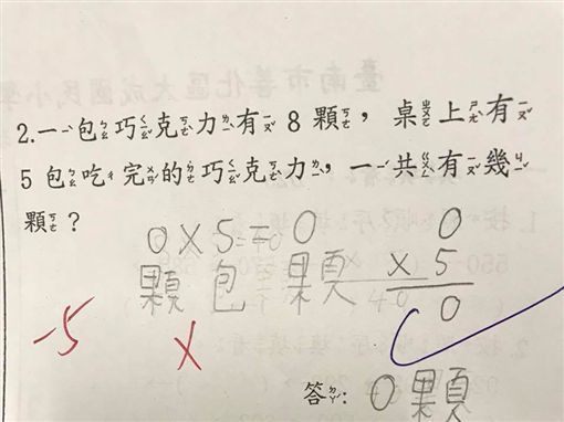 ▼原po表示,自己從小數學就不好,這天看到還在念小學二年級的兒子答錯一道數學題,他想了好久都不知道錯在哪裡,於是向網友們求助。這道題目是:「一包巧克力有8顆,桌上有5包吃完的巧克力,一共有幾顆?」兒子的答案是「40顆」,但這個答案是錯的。