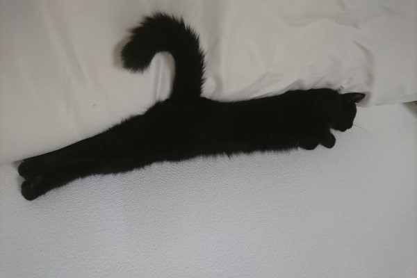 ▼在另一張照片中,黑貓再次展現對身體的超強掌控力。只見牠的身體、四肢伸得筆直,尾巴呈圓鈎狀,看起來就像丟在床上的「黑色衣架」。這款毛茸茸的黑色衣架萌萌的,在網路上引發熱議。
