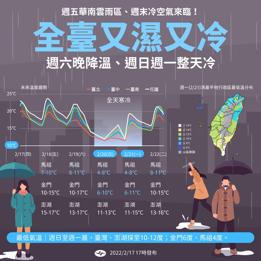 2022年02月18日週末氣溫大跳水,還有降雨相伴。中央氣象局在臉書發文說,從今天(18日)開始一直到週末,各地都會有雨,週六(10日)還有強冷空氣南下,華南雲雨東移,全台灣將呈現又濕又冷的天氣,中部以北的空曠地區氣溫可能降到10度以下。
