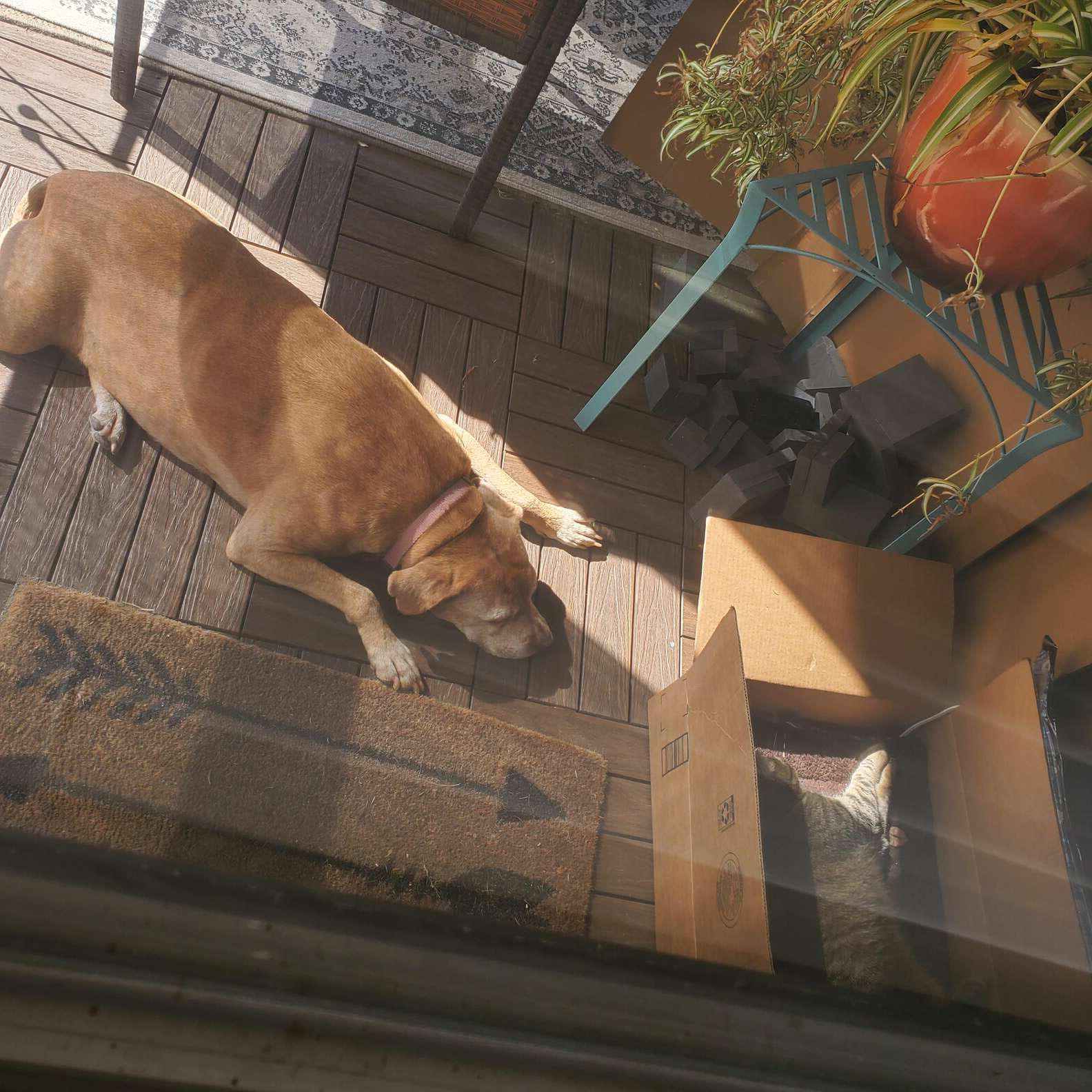 ▼Liz在門廊放置保暖用的紙箱,讓Sushi安心住下來,但Sushi最喜歡的不是自己的小窩,而是狗狗的懷抱。