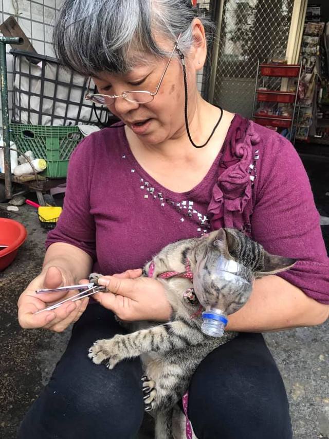 ▼有網友在臉書社團分享了一張照片,原來是他媽媽幫貓咪剪指甲時,竟然聰明的在貓咪嘴上套了一個剪半的寶特瓶!