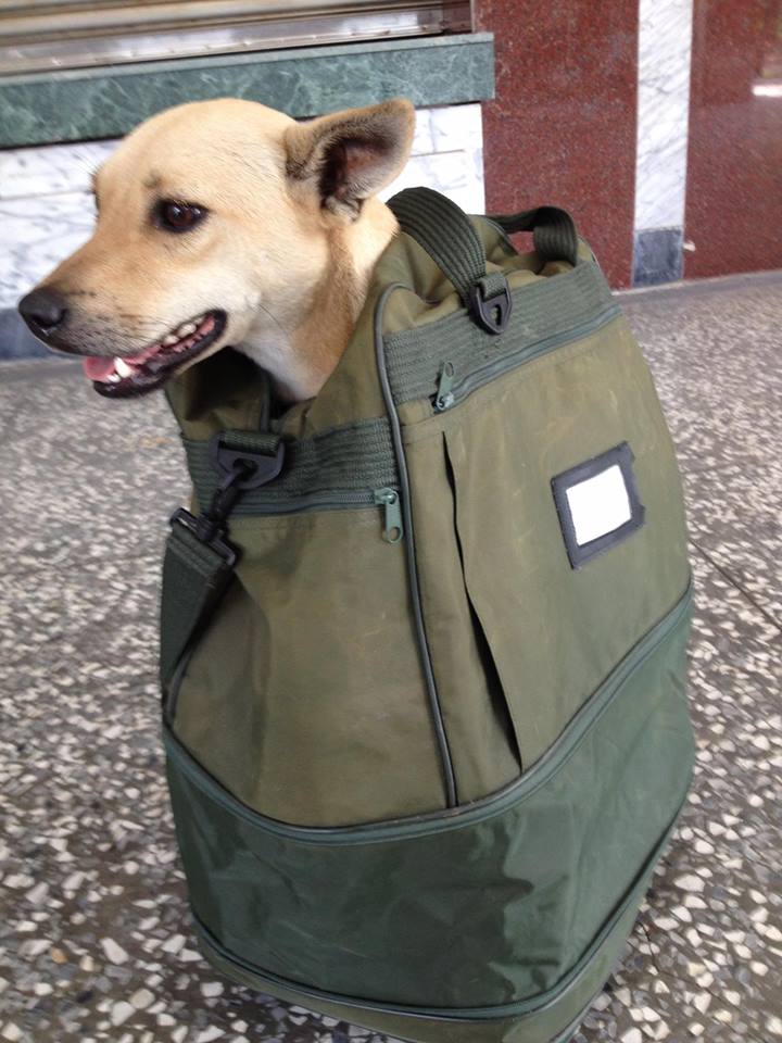 ▼終於到了退伍那天,劉黃黃把小黃妹裝進當兵的黃埔大包包,一路從頭城搭火車回到了桃園。小黃妹從來沒有搭過車,但牠好像明白劉黃黃的意思,一路不吵不鬧,非常安靜。牠的眼神從之前的無助變得很溫柔,大概也知道自己終於有家了。