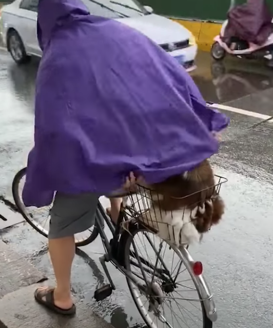 ▼阿公穿著斗篷雨衣,等狗狗坐好後,他掀開後背的雨衣蓋在狗狗頭上,防止狗狗淋雨。