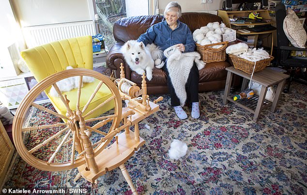 ▼為了做得更好,Jane每天練習紡紗,自家愛犬掉落的毛用完了,她就在臉書上發文徵求別人家薩摩耶掉落的毛。不少飼主願意提供,她在短短1年內就收到了100多則回覆。