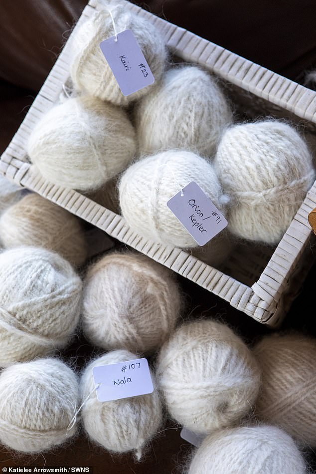 ▼Jane試著把自家2隻狗狗掉落的毛紡成紗線,剛開始她沒有經驗,於是花了不少時間做功課、上網學習。她先把蒐集起來的毛清洗乾淨,晾乾2、3天,再用紡車紡成紗線。
