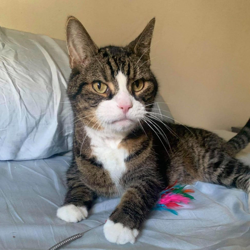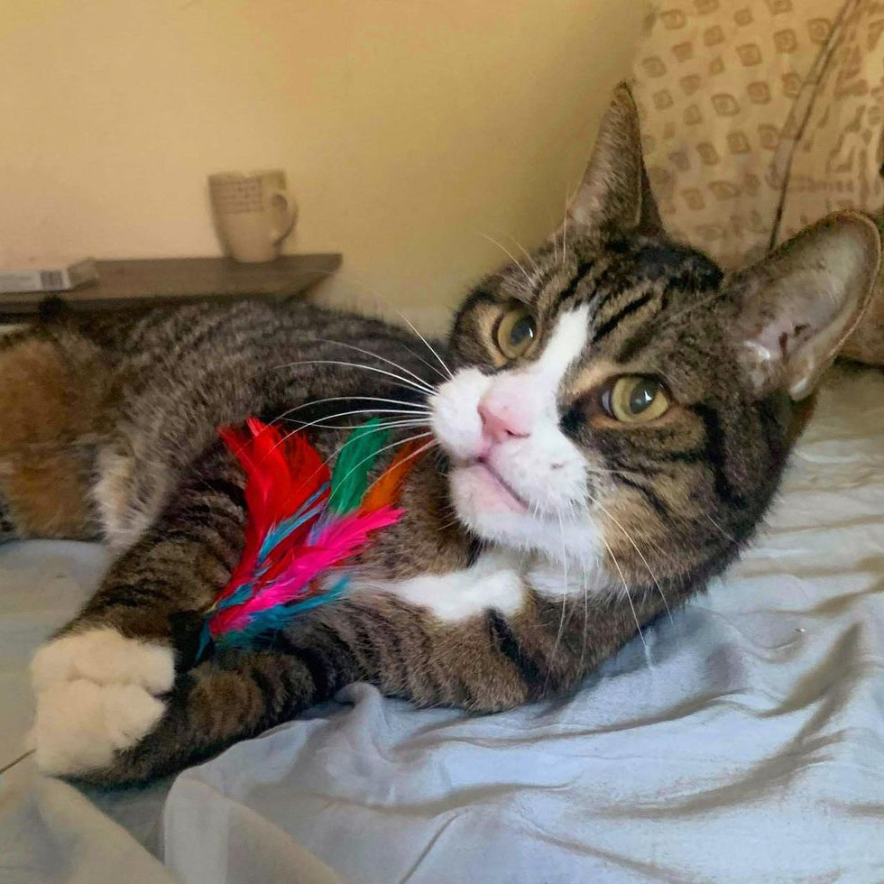 ▼Granpruno是一隻非常友善的貓咪,牠還很會撒嬌,每天都會求抱抱、求摸摸。在Steph和Francis的照顧下,牠的健康狀況越來越好,現在牠已經能像普通的寵物貓一樣生活,還愛上了逗貓棒。
