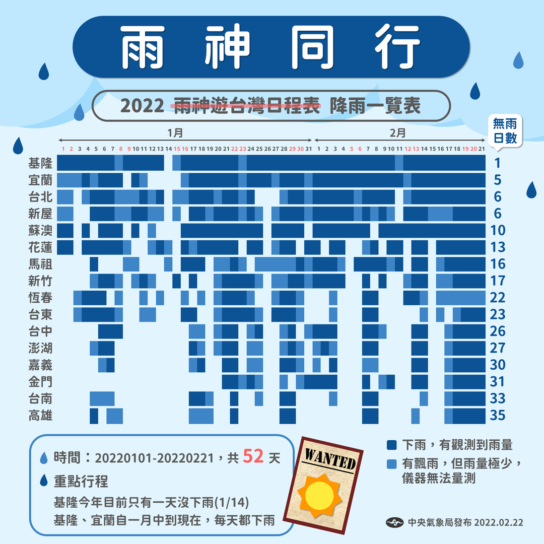 網友們看到降雨一覽表,紛紛留言說:「宜蘭,下到懷疑人生」、「對基隆人來說,出太陽就是新聞」、「好處是今年可能暫時不缺水」、「基隆無雨日僅一日,真無語了」、「我一直以為人要活著需要陽光水空氣,過了二月才知道,原來不用陽光也沒關係」。