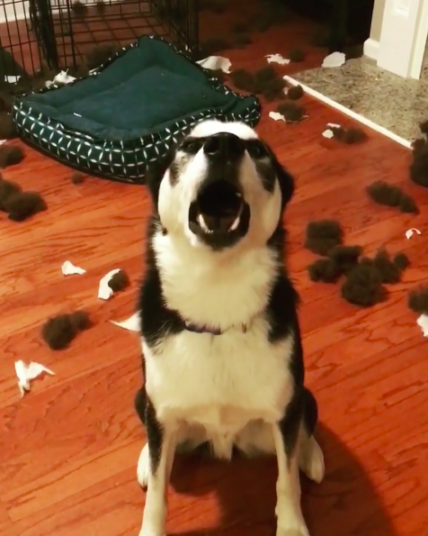 ▼那天晚上爸爸媽媽出門約會,留Blu和同伴待在家。牠大概不開心主人留下自己出去玩,竟然開始狂咬自己的床,連裡面的棉花填充物都挖出來了。主人回家後看到滿地狼藉,忍不住責罵Blu,牠卻超會頂嘴,主人說一句,牠就用更大的聲音頂回去。