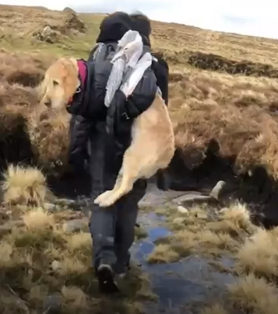 ▼Jean和Ciara是醫護人員,他們先幫狗狗檢查身體,發現牠飢餓又虛弱,於是拿出食物給牠吃。Neesha一直在發抖,Ciara就用自己的外套包住牠,來給牠保暖。Neesha身體虛弱,無法自己下山。山頂到山底有近10公里的距離,Jean和Ciara就用身上的圍巾綁起來變成背帶,背著Neesha一步步走下山。