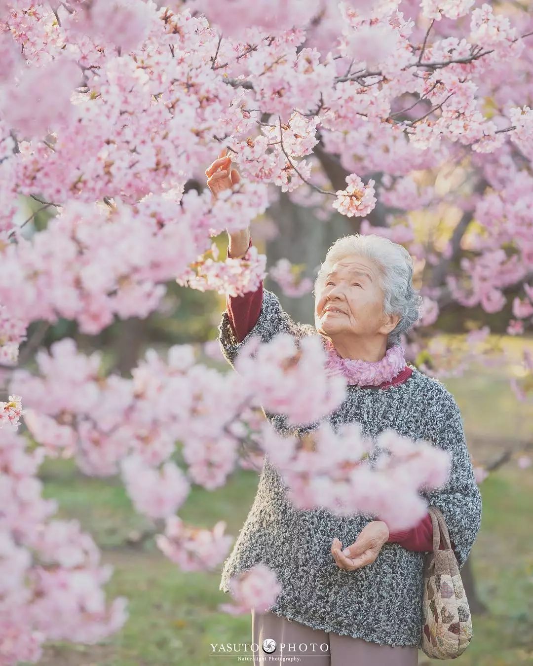 ▼婆婆已經八十多歲,臉上留下了歲月的痕跡,但在美麗的櫻花樹下,她笑得非常開心,就像一個18歲的少女。