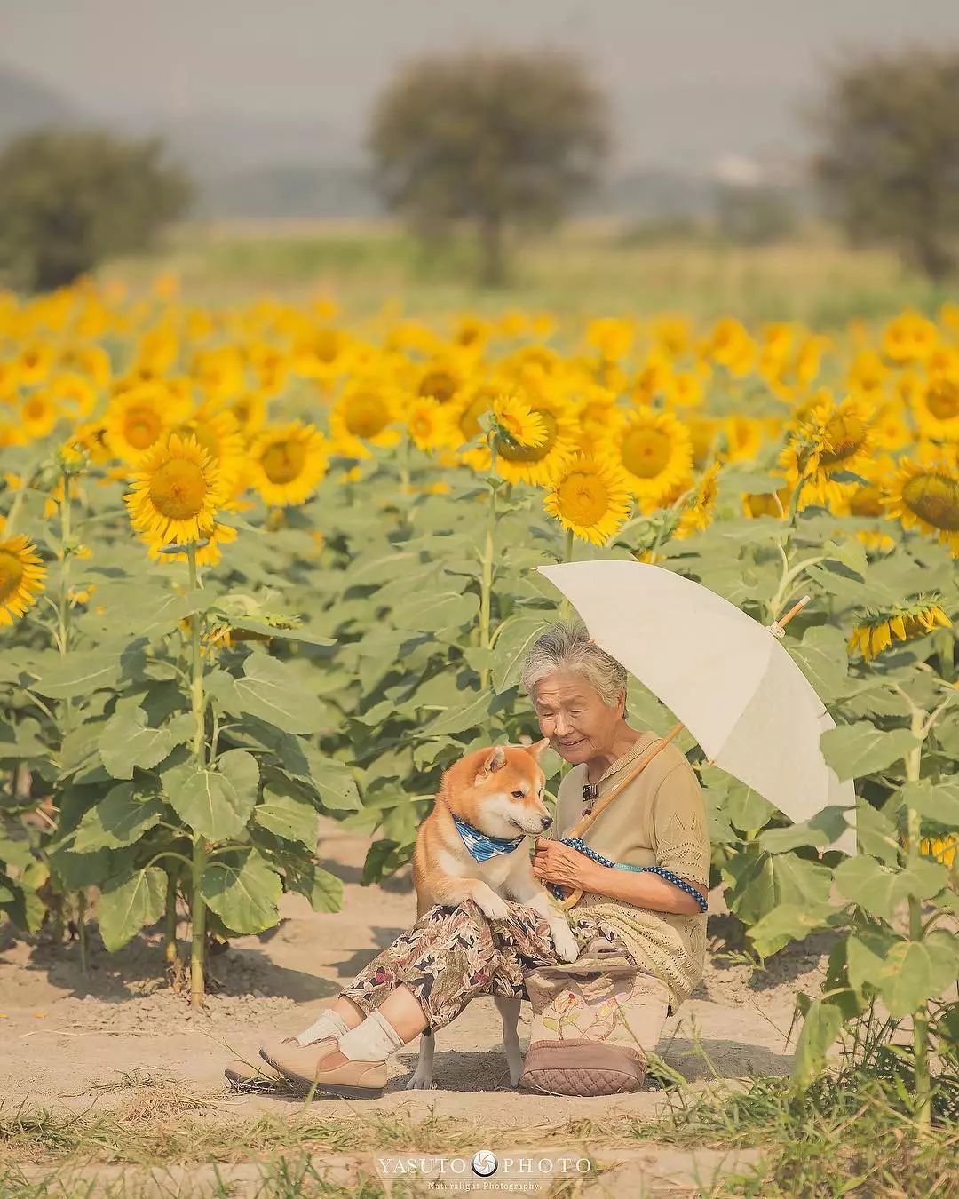 ▼和婆婆一起拍照的還有阿福。牠陪著婆婆走過向日葵花田、走過綠意盎然的鄉間小路、走過金黃的油菜花海…
