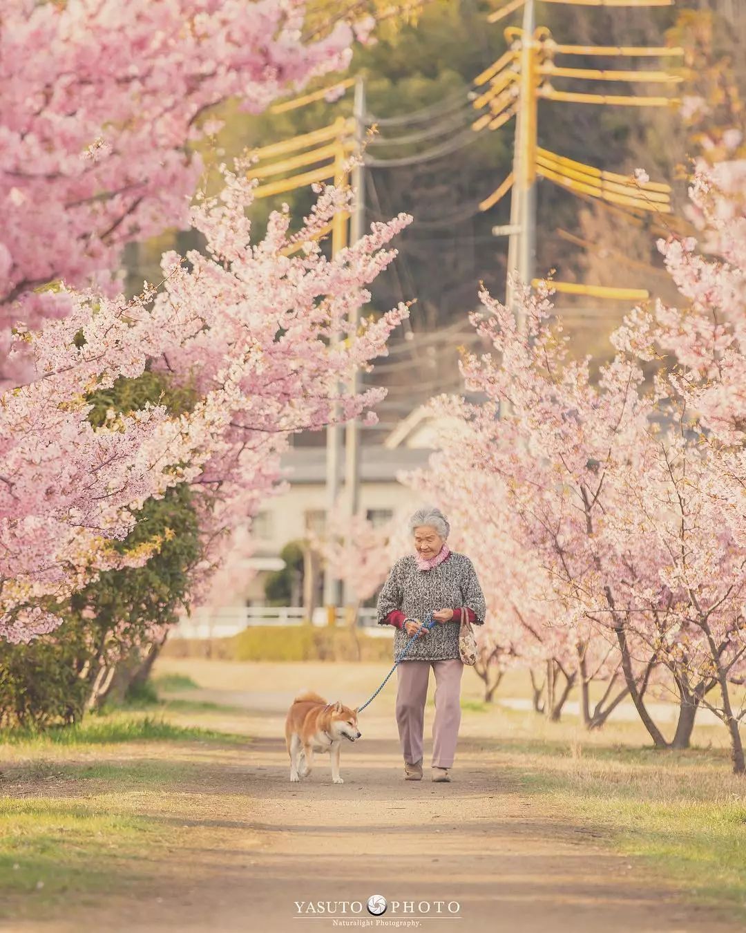 ▼YASUTO拍攝的櫻花照片中總是能看到這樣的畫面:溫暖的陽光、柔和的微風,還有走在粉紅櫻花樹下的一人一犬。