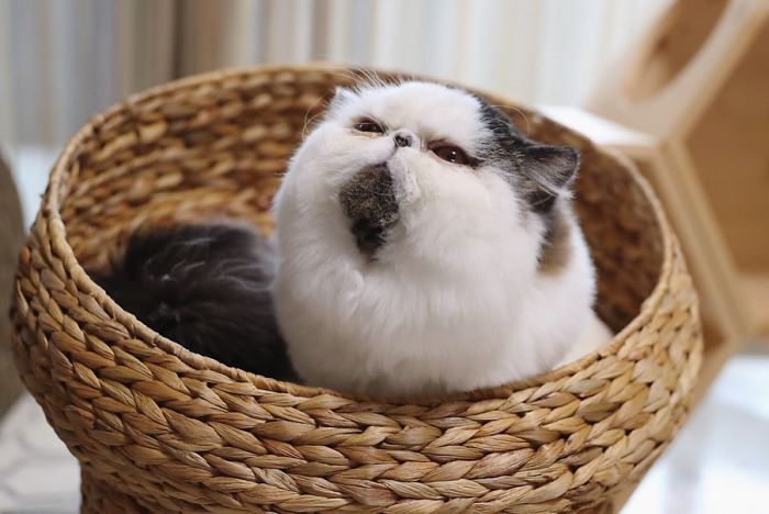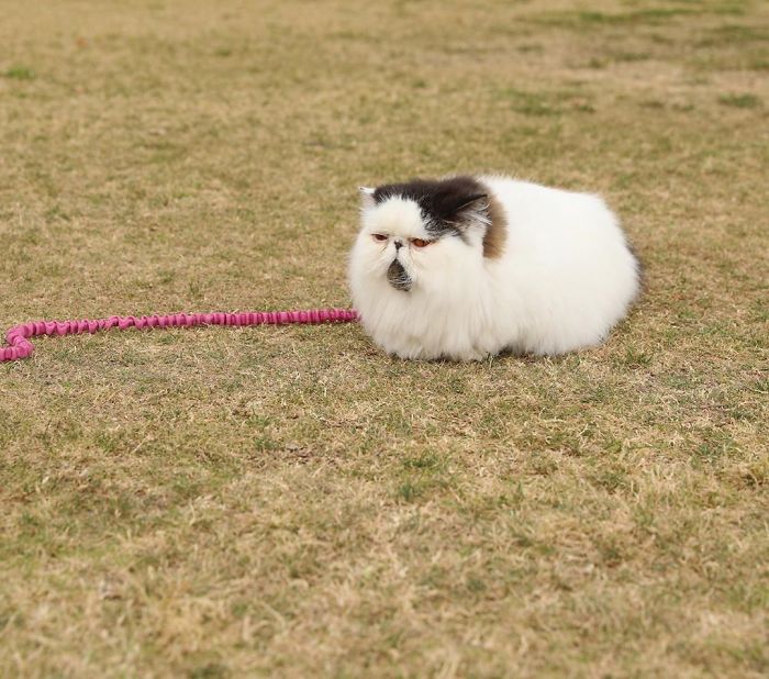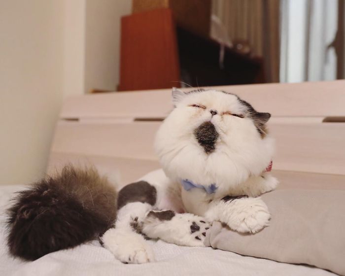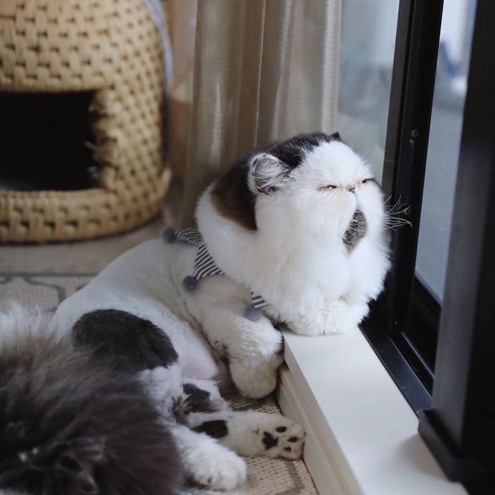 除了餵食,主人還要幫這兩隻貓咪梳毛。這種超圓潤、毛茸茸、看起來一直在呵欠的貓咪真是太可愛啦。快點追蹤一下貓咪們的Instagram,看更多萌照吧~
