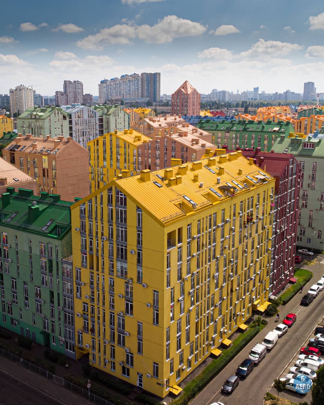「樂高之城」的設計靈感就來自樂高積木。從高處俯瞰這一住宅區,就像灰暗的世界中突兀出現的樂高積木群,跟周圍1950到1960年代的傳統建築群形成鮮明的對比。戰爭給基輔這座城市蒙上了一層灰濛濛的色調,這一童話般的住宅區讓人更加渴望和平了。