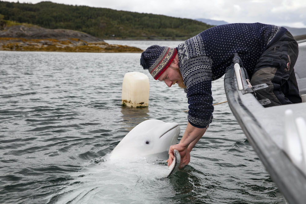 ▼這隻小白鯨叫Hvaldimir。2019年時,Hvaldimir出現在挪威漁村Inga附近海域,牠身上戴著奇怪的裝備,上面附有一個攝影鏡頭,還印著「聖彼得堡裝備」(Equipment St Petersburg)字樣。漁民們認為這隻小白鯨曾受過俄羅斯海軍的間諜訓練。