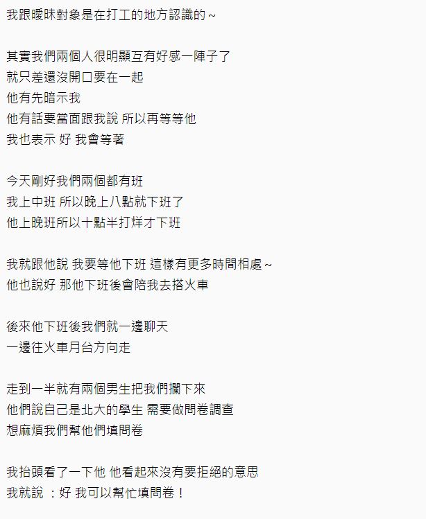 ▼原來原po和曖昧的對象是在打工的地方認識的,兩人相處起來明顯互有好感,可是卻有人願意先開口讓關係更進一步!結果就在那一個晚上,對方帶來了一個大驚喜!當時男生暗示原po有事想要當面講,要她先等一會。就在2人都有打工的某天,原po對男生說要去等他下班,這樣就能有更多的相處時間,男生也答應了。於是兩人都下班後,男生陪著原po一起往火車站走去搭火車。
